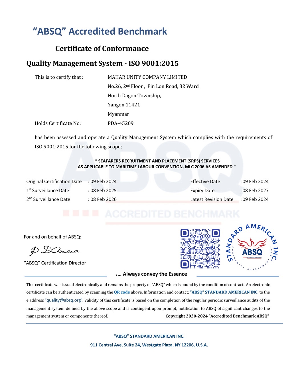 Mahar Unity has achieved the ABS Quality Management System (QMS) Certification, reflecting dedication to continuous improvement, operational excellence, and service quality that meets global standards.