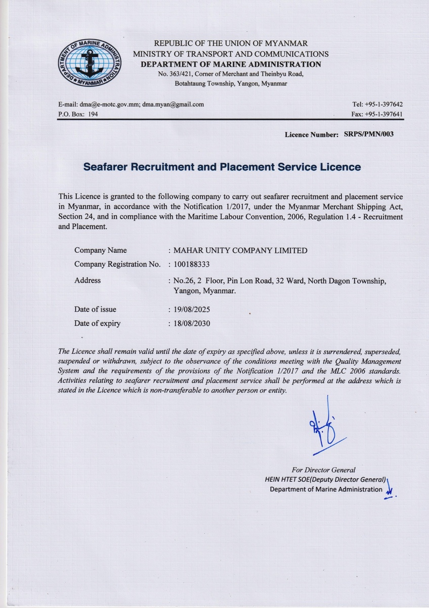 Mahar Unity is a dedicated seafarer recruitment and placement agency based in Myanmar. We pride ourselves on connecting skilled seafarers with reputable international shipping companies. Our experienced team is committed to delivering top-notch services and ensuring a seamless recruitment process for both employers and job seekers. Get to know us better and see how we can assist you in meeting your maritime workforce needs.